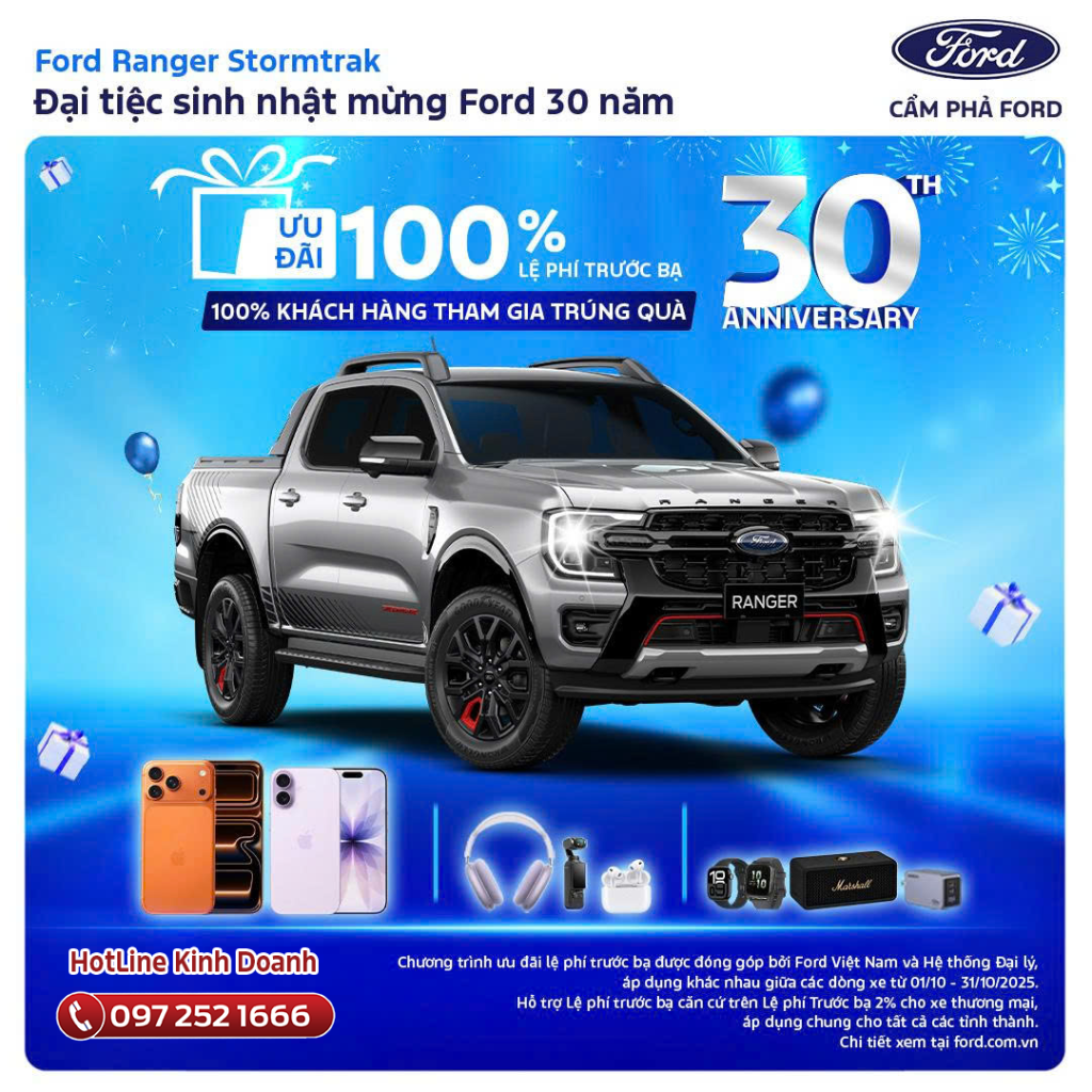 Nhân dịp Ford tròn 30 năm có mặt tại Việt Nam, Cẩm Phả Ford tại Quảng Ninh triển khai chương trình ưu đãi đặc biệt tháng 10/2025, mang đến hàng loạt chính sách khuyến mãi hấp dẫn dành cho khách hàng mua xe Ford.